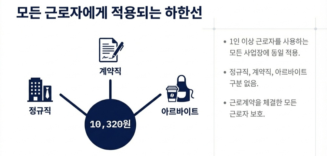 2026년 최저시급은 10,320원입니다. 이는 1인 이상 근로자를 사용하는 모든 사업장에 동일하게 적용됩니다. 정규직, 계약직, 아르바이트 구분 없이 근로계약을 체결한 모든 근로자가 보호 대상입니다.