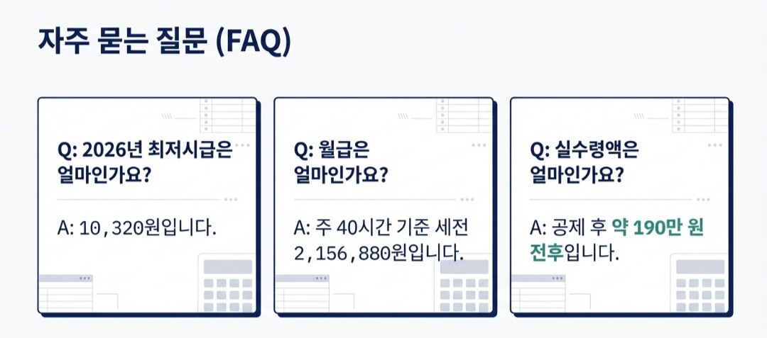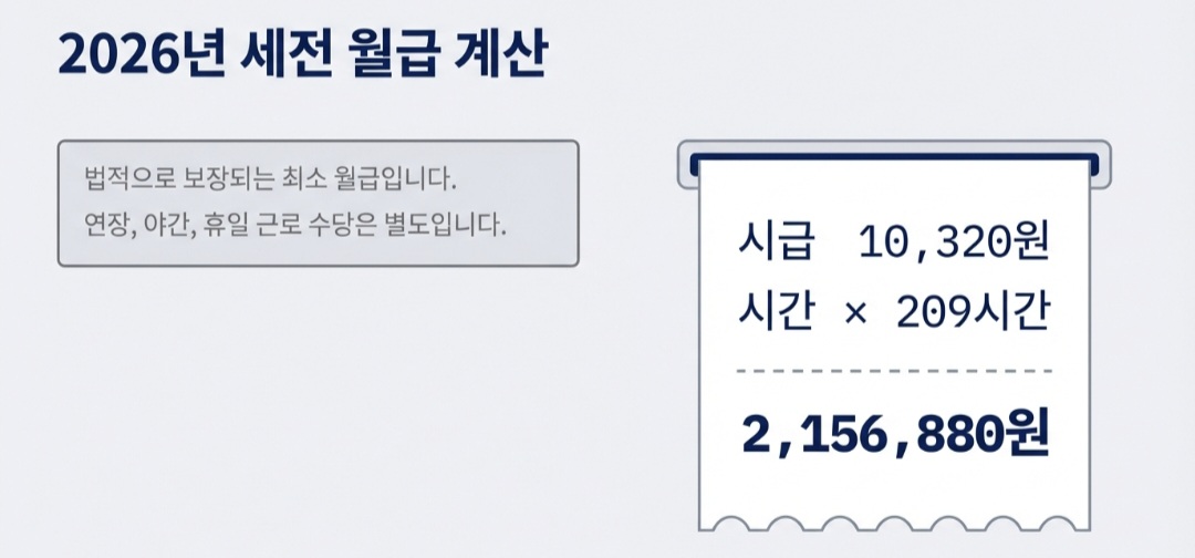 2026년 최저시급은 10,320원이며, 월급은 2,156,880원, 연봉은 약 2,588만 원 수준입니다. 공제 후 실수령액은 약 190만 원 내외로 예상됩니다. 근로계약 체결 시 세전·세후 금액을 반드시 구분해 확인하는 것이 중요합니다.