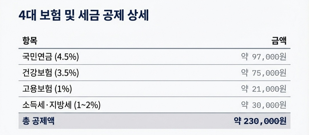 | 총 공제액 | 약 10~12% | 약 230,000원 |