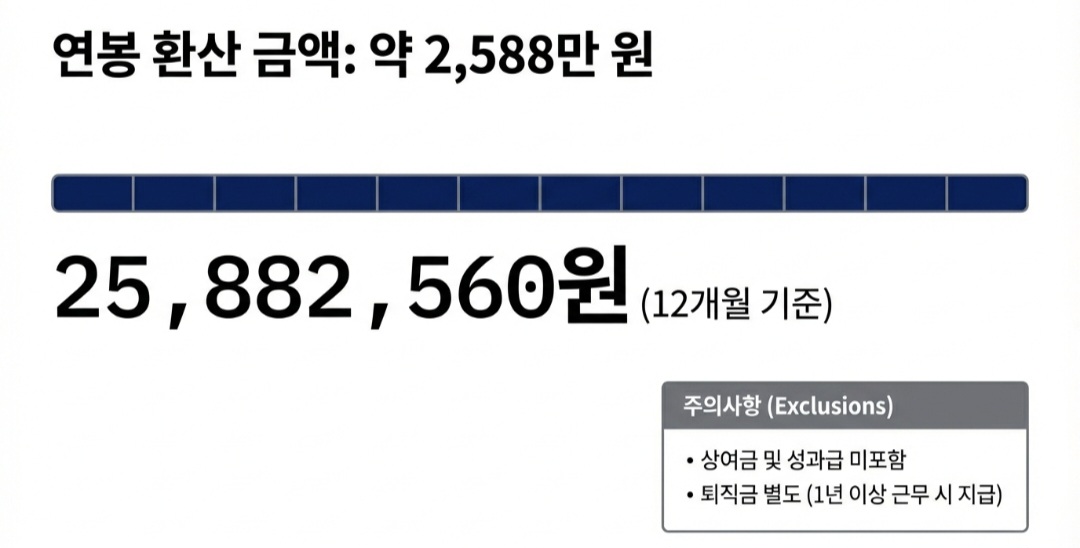세전 월급 2,156,880원을 기준으로 연봉을 계산하면 12개월 기준 25,882,560원입니다. 즉 약 2,588만 원 수준이 2026년 최저시급 기준 세전 연봉입니다. 이 금액은 상여금이나 성과급을 포함하지 않은 기본급 기준이며, 퇴직금은 별도로 1년 이상 근무 시 지급됩니다.